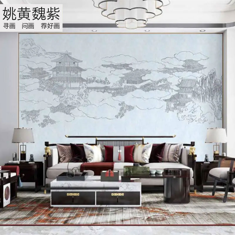 中国风祥瑞祥云纳福沙发背景墙柯桥刺绣墙布售楼中心软装全绣壁画