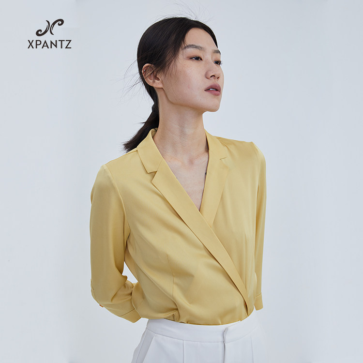创物说设计感女士小众修身黄色衬衫长袖衬衣2021新款早秋上衣热门设计联盟服务商