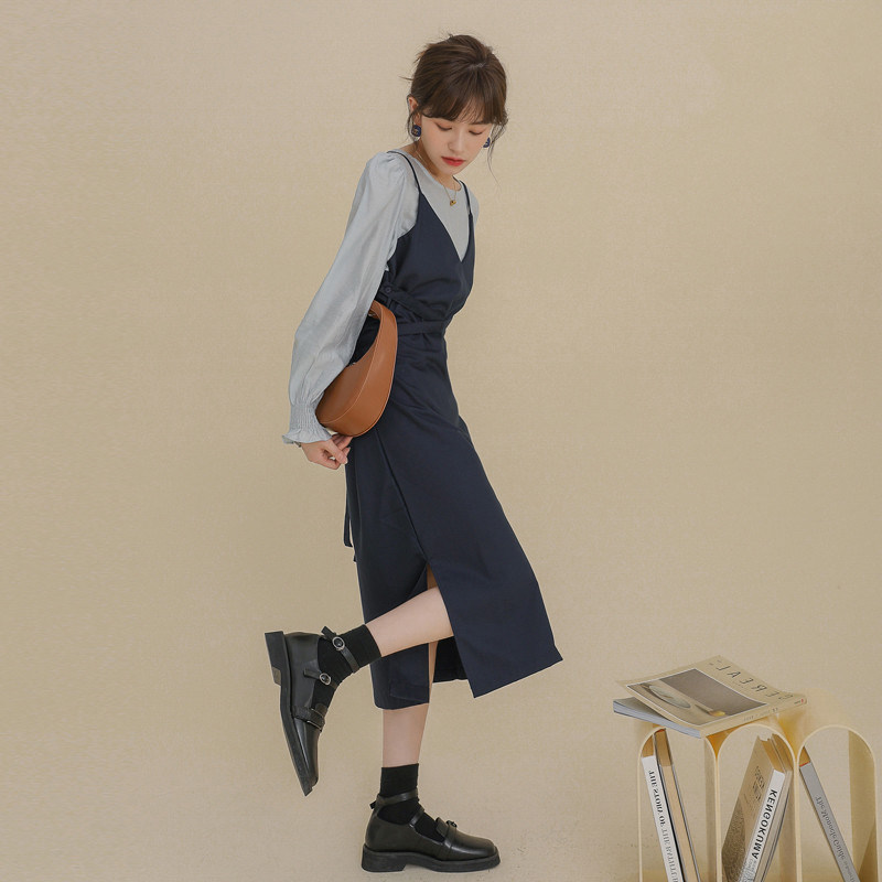 2021新款别致法式早秋长袖假两件长款设计感小众气质吊带连衣裙女热门设计联盟服务商