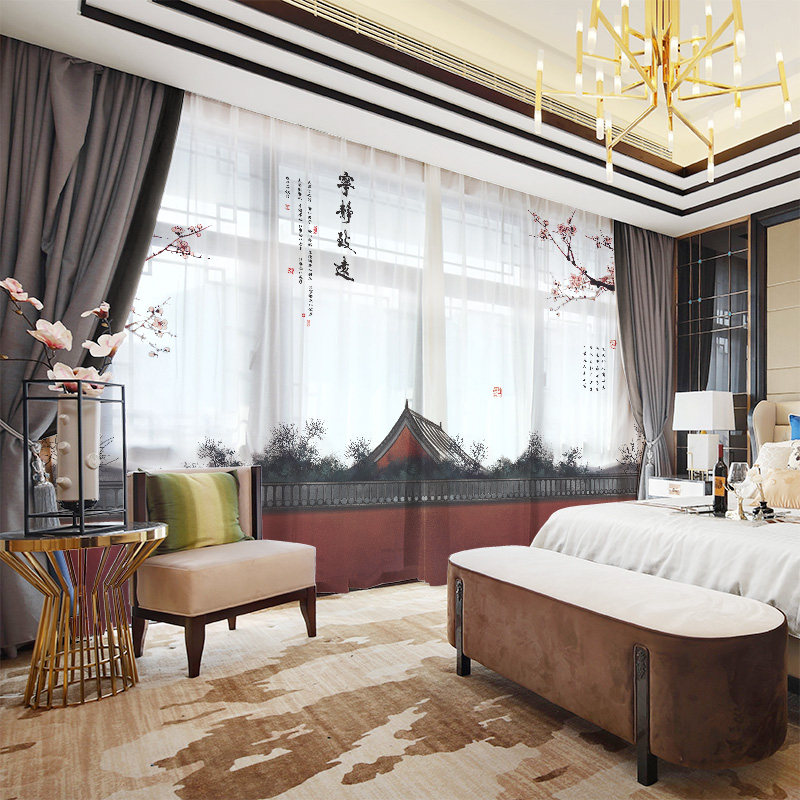 中国风花鸟古风建筑定制窗帘布纱帘中式客厅轻奢卧室办公酒店吉祥热门设计联盟服务商