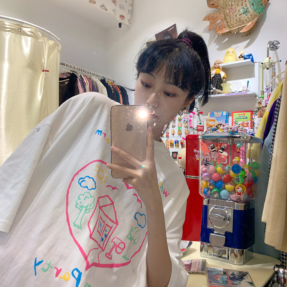 大宁短袖t恤女韩版宽松ins潮设计感小众印花夏季圆领白色减龄上衣热门设计联盟服务商