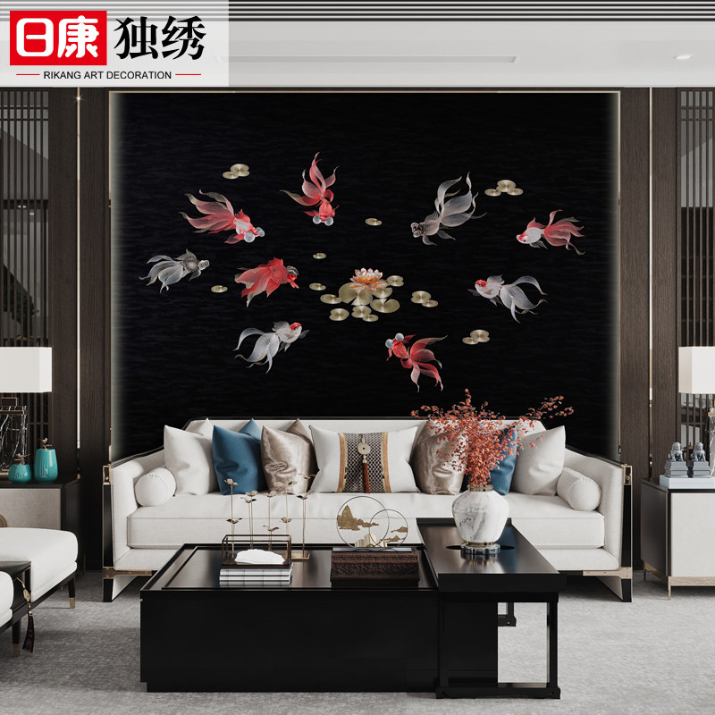 日康定制独秀刺绣墙布中式九鱼书房客厅餐厅电视影视沙发背景壁布热门设计联盟服务商